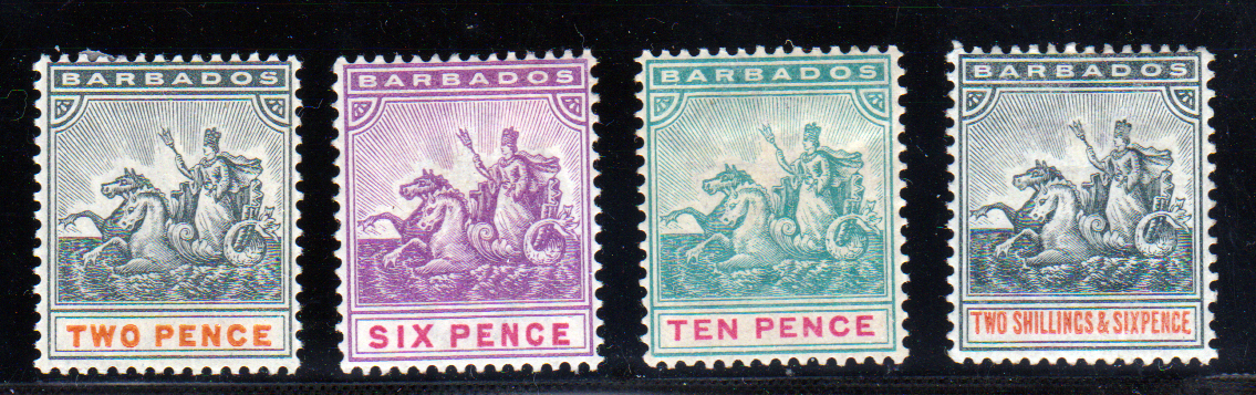 Barbados QV SG108, 111, 113 & 114 2d, 6d, 10d & 2/6 mint hinged Cat £103