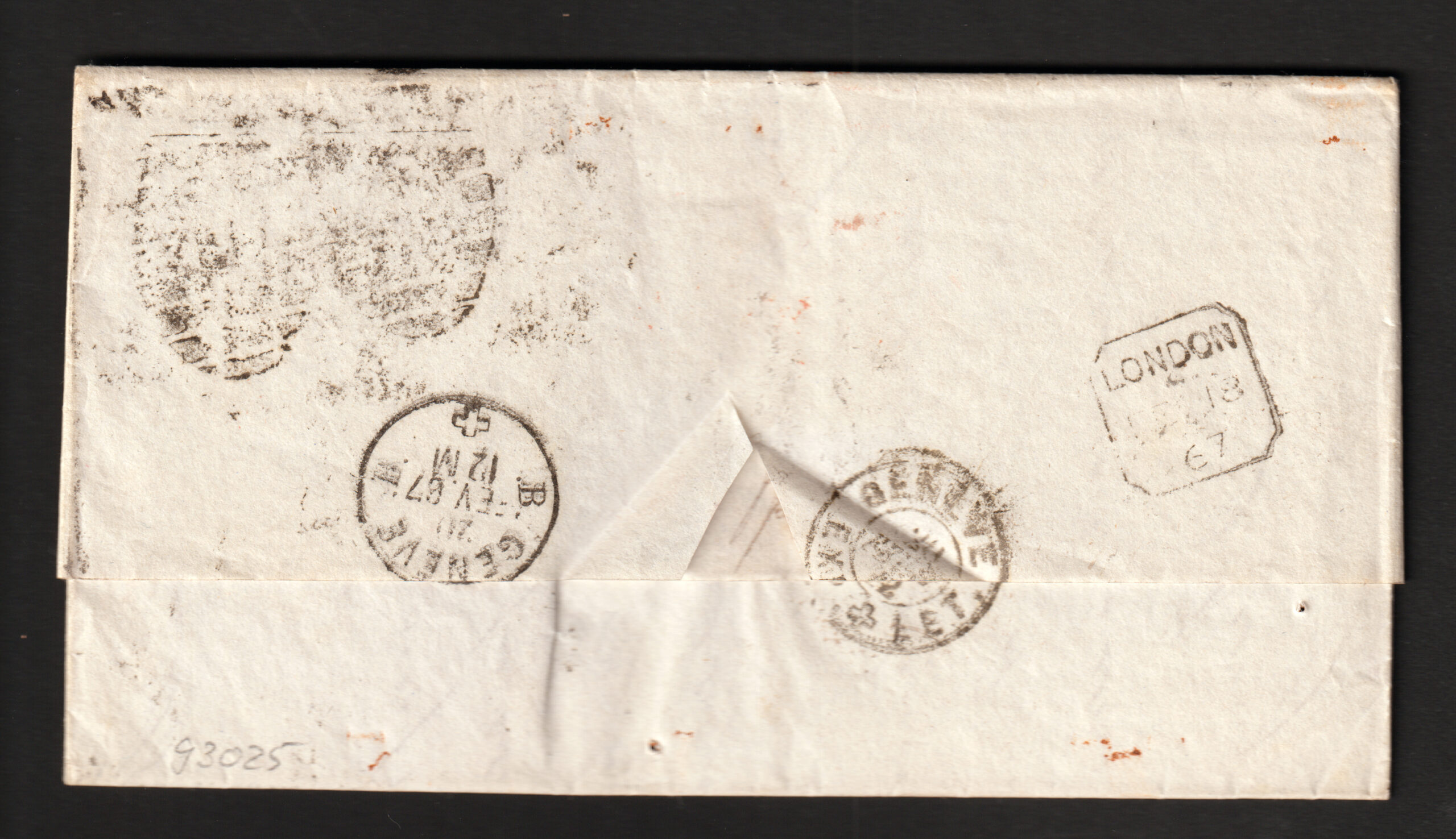 GB QV 1867 SG45 2d Blue & SG92 3d Rose on cover to Switzerland GB QV 1867 SG45 2d Blue plate 9, letter JH & SG92 3d Rose plate 4, on cover to Switzerland tied with numeral cancel 48, with various back stamps. #1076