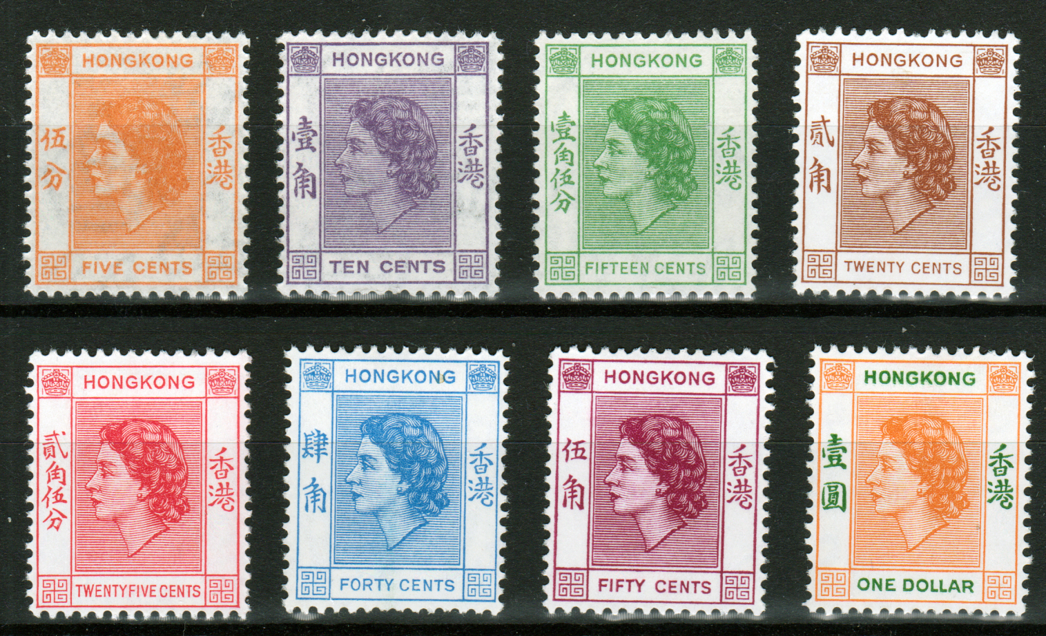 Hong Kong QEII SG178 5c orange, SG179 10c lilac, SG180 15c green, SG181 20c Brown, SG182 25c scarlet, SG184 40c bright blue, SG185 50c reddish-purple & SG187 $1 orange & green.